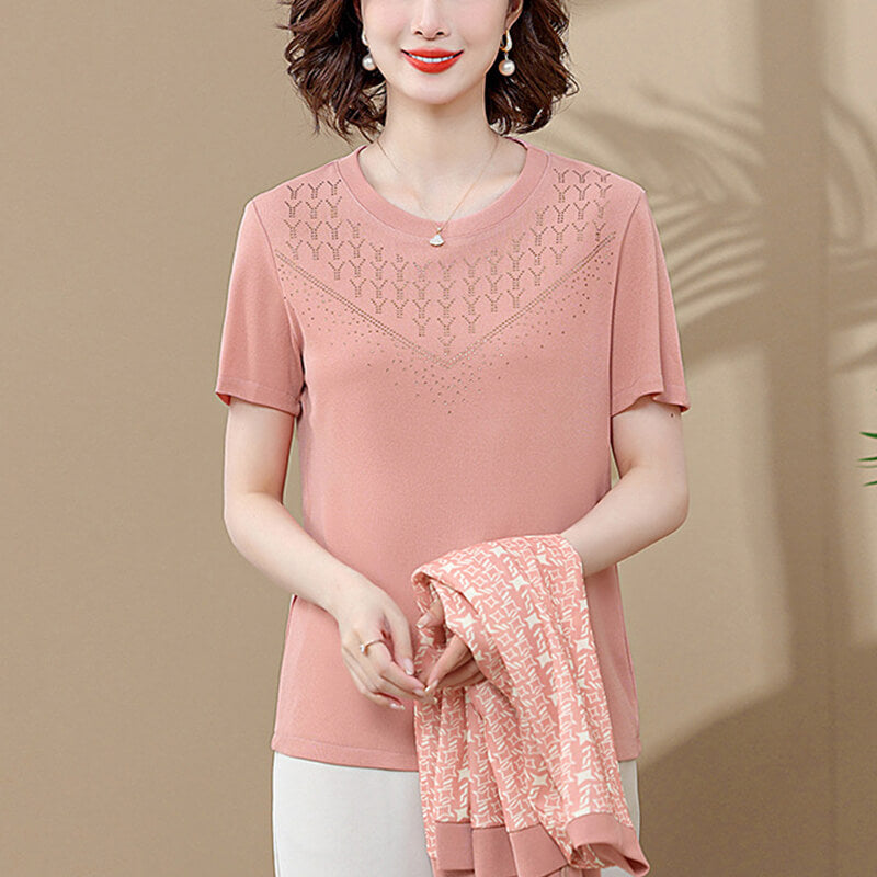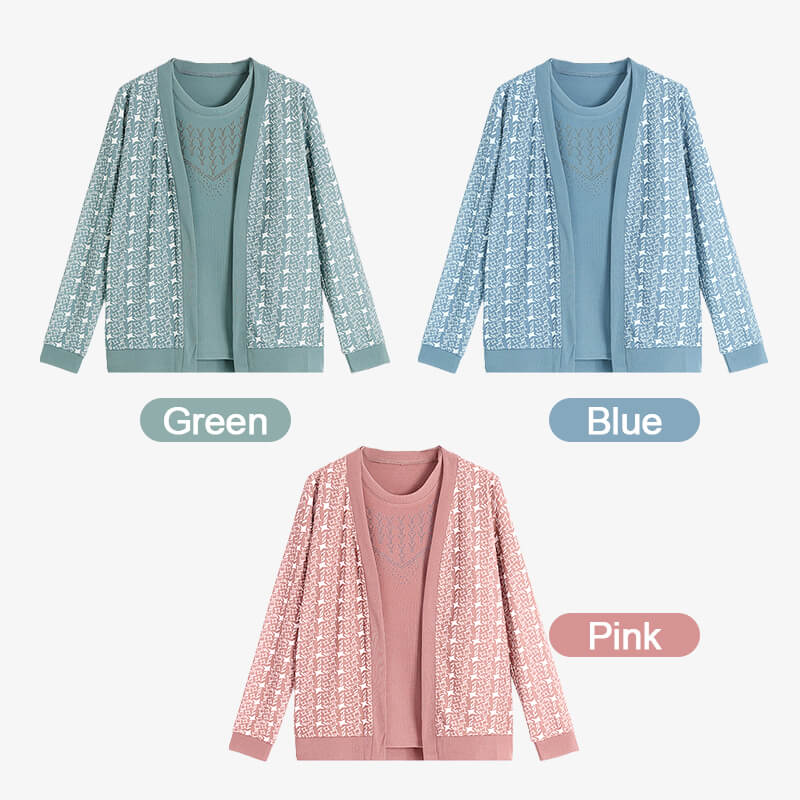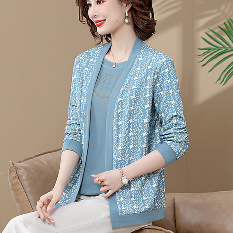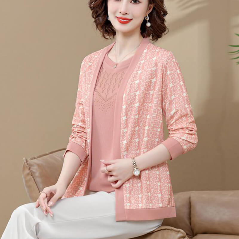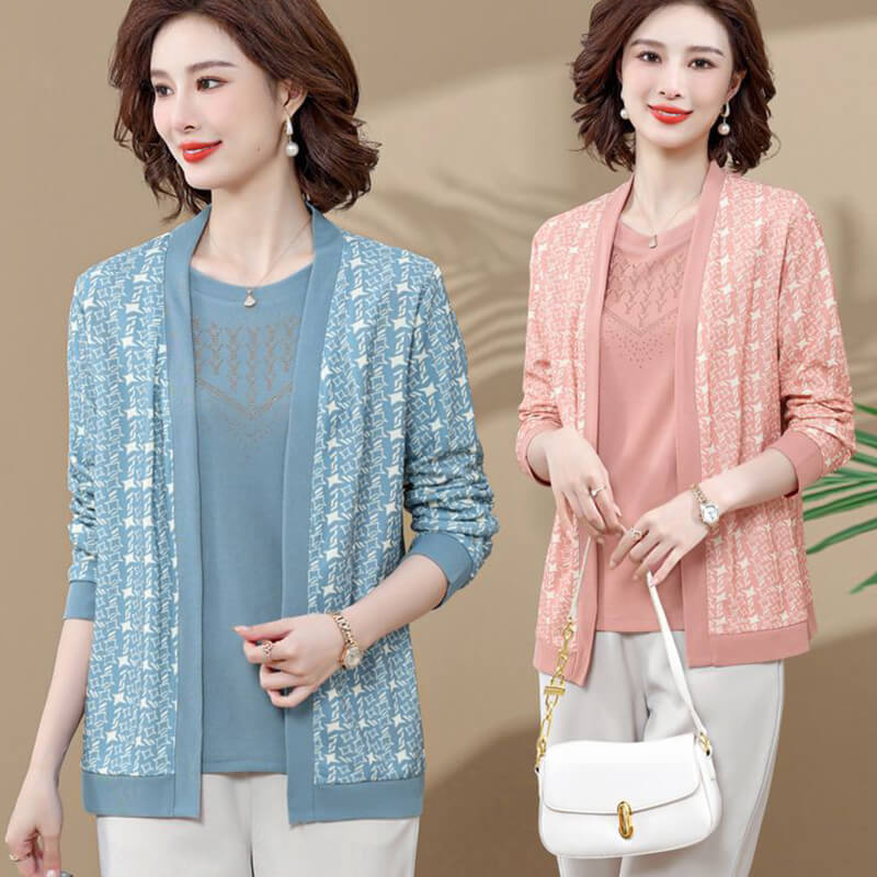 Mother two-piece female suits are women's suits made up of a matching round-neck T-shirt and an coat. The suits are designed to create a stylish and professional look suitable for various occasions, such as walks, shopping, and parties.